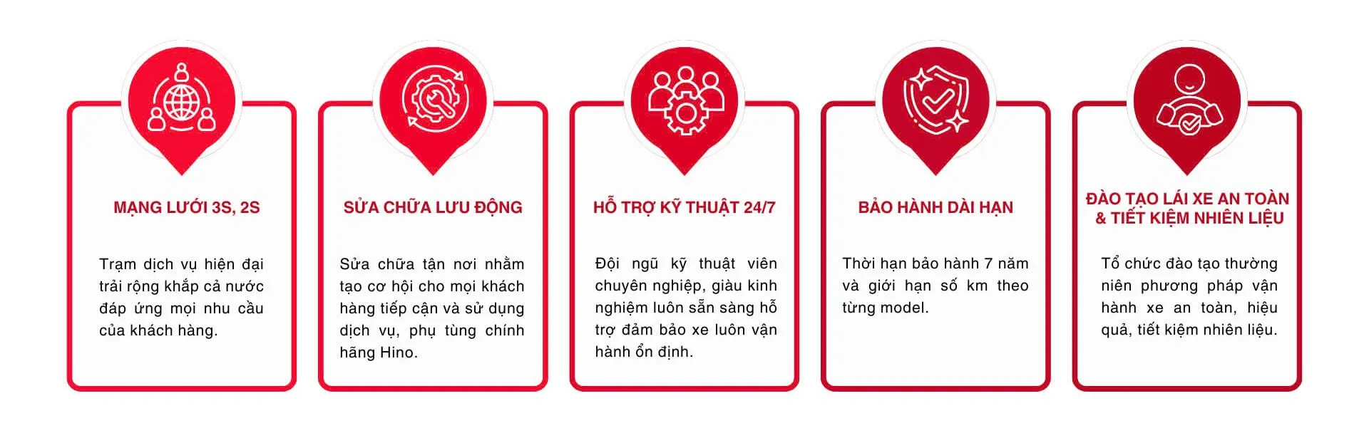 Với mục tiêu trở thành Bạn Đồng Hành Tin Cậy của khách hàng, Hino luôn cam kết cung cấp các dịch vụ hậu mãi chất lượng cao, đáp ứng nhanh chóng và hiệu quả mọi nhu cầu của quý khách, giúp tối đa hóa thời gian hoạt động, tối thiểu hóa chi phí vận hành.