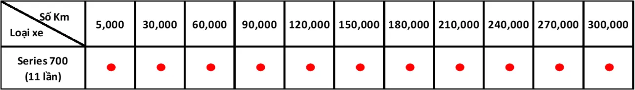 - Xe Series 700 (SS2P – Euro 5):Thực hiện gói bảo dưỡng tối ưu 11 lần, kéo dài tới 300.000 km.