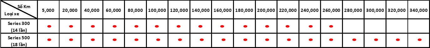 - Xe Series 500: thực hiện gói bảo dưỡng tối ưu 18 lần, kéo dài tới 340.000 km tăng thêm 7 cấp bảo dưỡng.